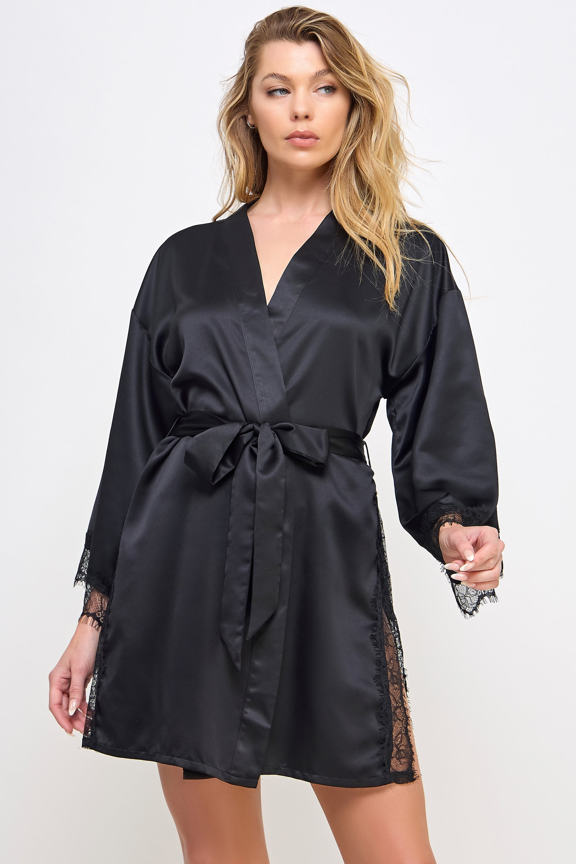 The Gillian Robe is a stunning piece that combines the smooth and luxurious feel of satin with a touch of romantic lace trim. This beautifully crafted robe features a sleek, flowing silhouette that drapes gracefully over the body, enhancing its allure.